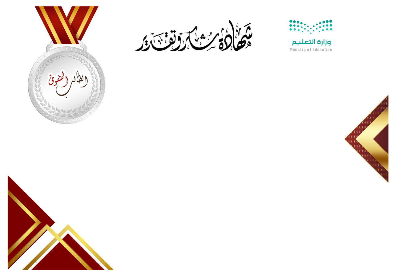 "وذلك لتفوقه في جميع المواد الدراسية خلال الفصل الدراسي الأول للعام الدراسي 1447 هـ، مع تمنياتنا لك بدوام التوفيق والنجاح."